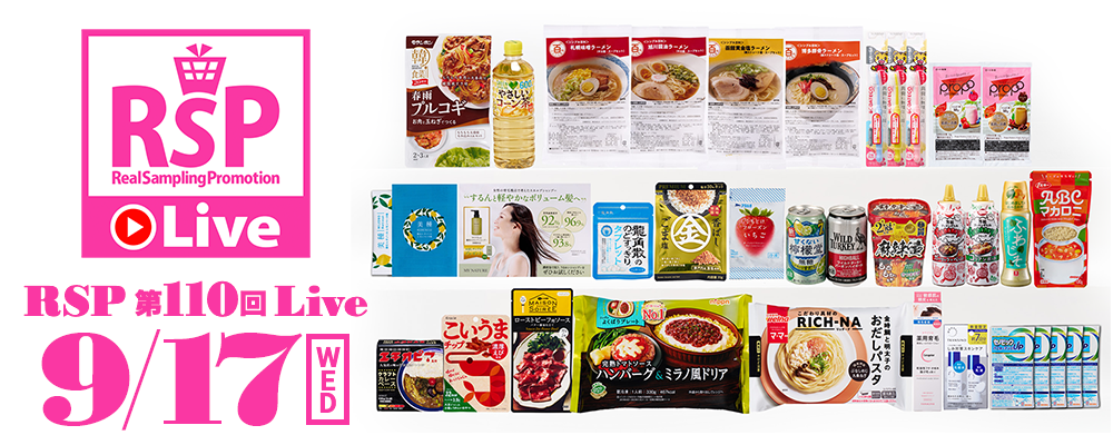 「リアルサンプリングプロモーション ライブ(RSP Live)」は、YouTube上で開催する大規模オンラインサンプリングイベントです。参加者のご自宅へサンプリング商品をお送りし、オンライン上のイベントを視聴いただく企画として開催しています。全国各地(日本国内限定、沖縄、離島除く)から、外出せずに自宅で参加いただけるため、会員の皆様に人気のイベントです。
